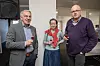 Von der Venstre-Fraktion gab es eine Zeichnung von Ole Weile mit dem radelnden Bürgermeister. V. l.: Poul Erik Kjær, Jan Fogh und Vizebürgermeister Martin Iversen