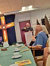 In der Ausstellung angekommen, wurden wir bei Kaffee und Kuchen zunächst von Ingrid Jacobsen begrüßt, dann übernahm auch Horst Jacobsen das Wort. Mit großem Interesse hörten wir den beiden zu, die von ihrer jahrzehntelangen künstlerischen Arbeit berichteten – vom Kennenlernen, über ihre Zeit an der Deutschen Nachschule Tingleff, bis hin zu gemeinsamen Projekten, Ausstellungen und der Liebe zur Kunst in all ihren Formen.