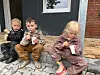 Lia, Lasse und Isabella (v. l.) lassen sich auf einer Treppe das Eis schmecken.
