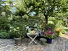 Im Laufe der Jahrzehnte ist dort eine Oase entstanden. Direkt hinter dem Haus steht ein hölzerner Gartentisch mit einer hell gemusterten Decke. Vier passende Stühle stehen daran. Die Sonne scheint jetzt im Sommer auf den Tisch, wo die beiden gerne auch frühstücken. Eine Pergola trennt die Terrasse von der Auffahrt. Buschige Pflanzen umrahmen das Ganze und geben Gemütlichkeit. Einige Pflanzen stehen in Töpfen. „Wir haben eigentlich keine Pflanze selbst gekauft. Entweder waren es Geschenke oder wir haben mit Nachbarn oder Freunden getauscht“, erzählt Christa.