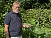 Gösta mit einer eben geernteten Zucchini, die auf dem Komposter gewachsen ist. Damit habe er hervorragende Erfahrung.
