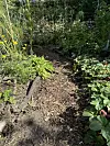Gehäckseltes Holz auf dem kleinen Weg zwischen den Beeten