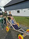 Drei ihrer Urenkelkinder ließen es sich nicht nehmen, Uroma Almstrup aufzufordern, eine Tour mit einem selbst gebauten Gokart mitzumachen – quasi als zusätzliches Geburtstagsgeschenk.