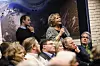 Schulrätin Anke Tästensen hatte eine Frage an das Folketingsmitglied Jesper Petersen – im Hintergrund ihr Sohn Lasse Tästensen, Abteilungsleiter des Deutschen Jugendverbands für Nordschleswig.
