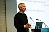 Das Folketingsmitglied Jesper Petersen (Soz.) – im Hintergrund – berichtete über die aktuelle dänische Politik.