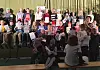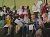 Alle versammeln sich vor der Bühne für das erste Lied: Schulleiterin Viola Matthiesen (Mitte rechts) mittendrin.