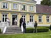Die Gruppe auf dem Hof des Gutshauses, das 1904 nach einem Feuer weitgehend neu aufgebaut wurde, nur die Fassade des 1883 neu erbauten Hauses wurde in den Neubau integriert.