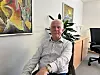 Geschäftsmann und Trixie-Gründer Bonnik Hansen ist vom sportlichen Einsatz von Rollstuhlfahrer Stephan Laukamp aus Tingleff angetan und möchte ihn dabei unterstützen, ein neues Sportgerät anzuschaffen. Das Foto zeigt den ehemaligen Rapstedter im Geschäftsführerbüro der Seniorenresidenz Tarp, die er errichten ließ und besitzt.