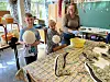 Maurice sitzt konzentriert am Tisch und packt eine klebende Masse auf ein Drahtgeflecht. Die Umrisse lassen bereits erahnen, was entstehen wird.