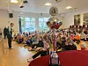 Dort findet der Auftakt für den Bewegungstag (motionsdag) statt. Während sich anfangs alle auf dem Boden setzen, steht vorn auf dem Flügel der Wanderpokal.