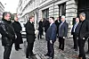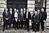 Schleswig-Holsteins Ministerpräsident Daniel Günther begrüßt den neuen Kopenhagener Sekretariatsleiter Harro Hallmann in der Peder Skrams Gade. Hinter Günther reihen sich unter anderem Botschafter Detlev Rünger und der Minderheitenbeauftragte der Bundesregierung Bernd Fabritius an.