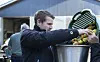 SP-Kandidat Thore Naujeck beim Befüllen der Apfelpresse bei der Aktion der Schleswigschen Partei in Eggebek-Feld. In seinem Wohnort Fröslee wurde es kurz darauf ebenfalls fruchtig, als man dort eine öffentliche Obstplantage einweihte.