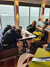So kamen die Radlerinnen und Radler sehr rechtzeitig am Fährhafen an und mussten gut eine Stunde in Decken gehüllt auf die Fähre warten. Da taten dann das Buffet, der Kaffee und die Wärme an Bord gut. Dem tat der Seegang dann auch keinen Abbruch.