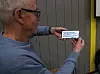 Jes Jessen mit Handyfotos von alten „Nordschleswiger“-Tischtennisberichten