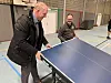 Sparkassen-Filialleiter Carsten Hansen (links) und Tischtennisspartenleiter Bent Holt spielen sich den Ball neben der Platte zu. Das Geldinstitut hat die Ü60-Abteilung des SV Tingleff finanziell unterstützt.