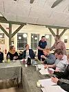 Kassenwart Thomas Carstensen (stehend, r.) gratuliert dem neugewählten Suppleanten Timo Rüdiger zur Wahl. Am Tisch sind die Vorstandsmitglieder Merrit Henning, Mathilde G. Jessen, Simon Petersen, Rasmus Jessen und Eva Jessen zu sehen (v. l.).