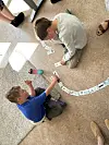 Sobald die Jungen die verschiedenen Domino-„Steine“ richtig aneinandergelegt hatten, mussten sie sie umdrehen: Auf der Rückseite wurde ihnen dann eine Textaufgabe gestellt. Die Lösung war wieder eine Zahl für das Vorhängeschloss.