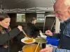 Eline und Solvej sowie ihre Mitschülerinnen und Mitschüler haben die warme Suppe als Aufgabe übernommen, haben dafür eingekauft, sie gekocht und verkaufen jetzt die Linsen- und Erbsensuppe. An diesem kalten und äußerst regnerischen Novembertag findet sie guten Absatz.