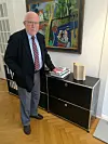 Der ehemalige Ministerpräsident der DDR, Lothar de Maizière, mit einem Stein aus dem Brandenburger Tor.Foto: Buhrmann