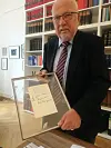 Lothar de Maiziére mit der Menükarte vom 12. September1990 mit den Signaturen der TeilnehmendenFoto: Buhrmann