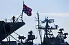 Ein russischer Matrose (l) salutiert am Bug des Raketenkreuzers Moskwa».