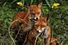Zwei Füchse sitzen unter Narzissen am Ufer des Dodder-Flusses.