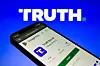 Die Truth-App von Trump-Media wird im Google Play Store auf einem Smartphone mit dem Logo im Hintergrund angezeigt.