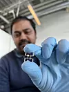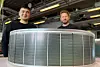 Forscher Sambathkumar Balasubramanian mit einer beschichteten Einheit. Die Forscherinnen und Forscher der Einheit entwickeln ständig neue Solarzellenelemente, um die Energiegewinnung zu steigern.