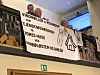 Mehrere Protestbanner von den Bewohnerinnen und Bewohnern in Avnbøløsten hingen am Zuhörerbalkon des Stadtratssaals.