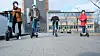 Die Stadtverkehrsplaner Johanna Carstensen und Aaron Radloff testen gemeinsam mit Norbert Krause von der Firma Bird und Oberbürgermeisterin Simone Lange (v.l.) die E-Scooter.