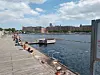 Es tut sich ein abgegrenzter Bereich im Wasser auf. Typische Schwimmbad-Plastikringe umsäumen eine Zone, die etwa so groß wie ein Schwimmbecken ist. In der Mitte befindet sich ein schwimmendes Holzgebilde, das an einen Whirlpool erinnert. Die Stufen an der Hafenkante sind lückenlos voll. Eine junge Frau verkauft Crêpes, und ein Kaffee-Bike steht auch bereit.