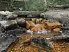 Dort, wo das Quellwasser mit dem Luftsauerstoff in Kontakt kommt, fällt das Eisen aus dem Wasser aus.