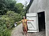 Projektleiterin Alice Øvlisen Brun freut sich über die finanzielle Förderung für das Projekt in Wiesby. Links neben dem Gebäude wird eine behindertengerechte Toilette gebaut. Der Pfad, auf dem Alice steht, führt durch die beiden verbundenen Gebäude hindurch.