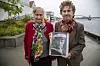 Ida Gatz schaut sich den Gedenkstein an der Sonderburger Hafenfront genau an, während sie ein Foto ihres Bruders in der Hand hält.