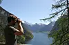 Kristallklares Wasser, Bergpanorama, darunter glitzert der Königssee. Scheinbar allein in der Idylle posiert jemand fürs Foto: