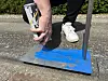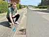 Mit blauer Sprayfarbe auf dem Bürgersteig markiert Jeppe Lorenzen einen Ablaufschacht in der Sonderburger Ankersgade. Wichtig zu wissen: Auch die Gullys, die nicht gekennzeichnet sind, leiten in die Natur ab.