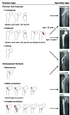 Die obere Bildreihe zeigt einen weniger schmerzhaften Bruch des Oberschenkelhalses. In der unteren Bildreihe ist der Bruch unterhalb des eigentlichen Halses; dann ist es besonders schmerzhaft. Rechts sind die Röntgenbilder von korrigierten Brüchen zu sehen (Aus dem Aufsatz: „A new algorithm for hip fracture surgery“ von Henrik Palm, Michael Krasheninnikoff, Kim Holck, Tom Lemser, Nicolai Bang Foss, Steffen Jacobsen, Henrik Kehlet und Peter Gebuhr in „Acta Orthopaedica“).