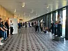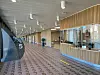 Das Wartezimmer ist der 180 Meter lange Gang, der mit Holzpaneelen, gläsernen Wegweisern und modernen Sitzgruppen in frischem Steingrau und Holz ausstaffiert ist.