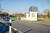 Ein dritter, jedoch deutlich kleinerer Container steht im Grasstreifen in der Straßenmitte. Wenn die Grenzkontrolle besetzt ist, wird dort ein Beamter sitzen, den Verkehr beobachten, scannen und einige Autofahrer in den Zelttunnel zur Kontrolle leiten.