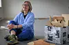 Künstlerin Anneli Olesen sitzt zwischen Holzfragmenten im Alten Hafenamt, wo sie aus früheren Arbeiten neue Werke für die Ausstellung „fragmentum“ entwickelt.