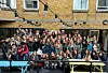 Mitschülerinnen und Mitschüler der Hoptrup Efterskole posieren in London, wo sie gemeinsam den X-Faktor-Sieg von Hugo Almeida (1. Reihe, 2. von links) feiern.