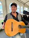 Benjamin Kriesel hilft im Instrumentenzelt beim Stand von „Sprottensound Vintage Guitars“ mit.