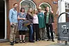 Regisseur Frelle Petersen, Ladeninhaberin Kirsten Lützen und vom Schauspielerteam Jette Søndergaard, Mette Munk Plum, Ole Sørensen und Lasse Lorenzen (v. links), stellten sich während der Dreharbeiten der Presse am Drehort an der Tonderner Westerstraße.