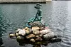 Links taucht ein Springbrunnen mit eigenartigen Gestalten auf. Und im Hafenbecken erblicken wir sie dann: die genmanipulierte Meerjungfrau des Künstlers Bjørn Nørgaard.