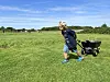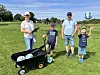 Auf zum nächsten Loch auf der Fußball-Golfbahn: Eine Familie aus Süddeutschland zieht in Guderup ihre Runden. Wie alle Gäste dürfen sie den Park völlig kostenlos nutzen.