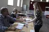 Wahlhelfer Troels Petersen (l.) bei der Abstimmung zur Folketingswahl im Juni 2019 in Osterhoist, als er Erstwählerin Andrea Sørensen ihren Stimmzettel aushändigt. (Archiv)