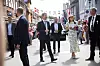 König Frederik (Mitte) und Königin Mary spazieren auf dem Weg zu ihrer Sommerresidenz im Schloss Gravenstein neben dem Bürgermeister von Sonderburg (Sønderborg), Erik Lauritzen (Soz.), der rechts im Bild zu sehen ist.