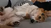 Corgi Theo beim faulenzen auf der Couch.