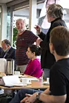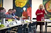 Torben Nicolaisen (l,) und Carsten Boye(stehend) waren als diskussionsfreudige Vertreter der Alternativen in Apenrade präsent.Vor ihnen Anna Astrid Høj Nielsen von der Veganerpartei.