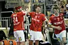 Freude bei Mikkel Hansen (l.) und Aaron Mensing (Mitte) beim dänischen Sieg gegen Spanien